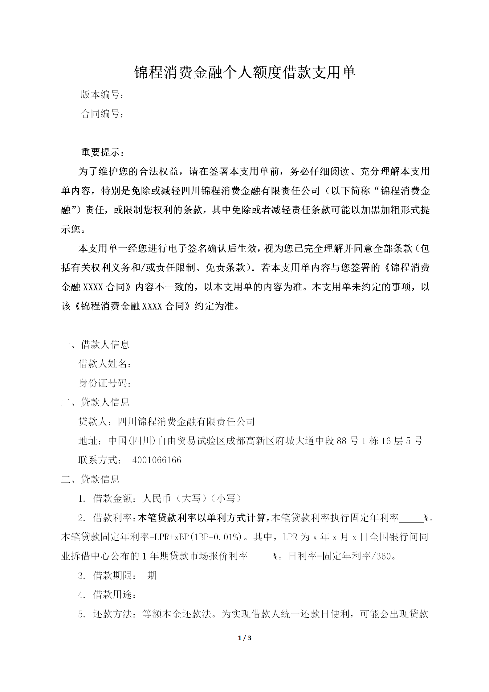 锦囊贷个人额度借款支用单