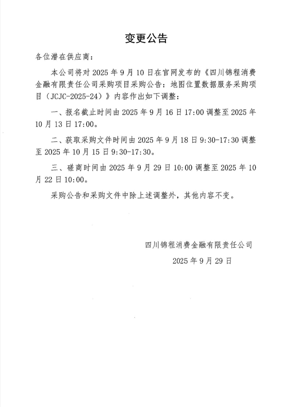四川锦程消费金融有限责任公司采购项目变更公告:地图位置数据服务项目(JCJC-2025-24)