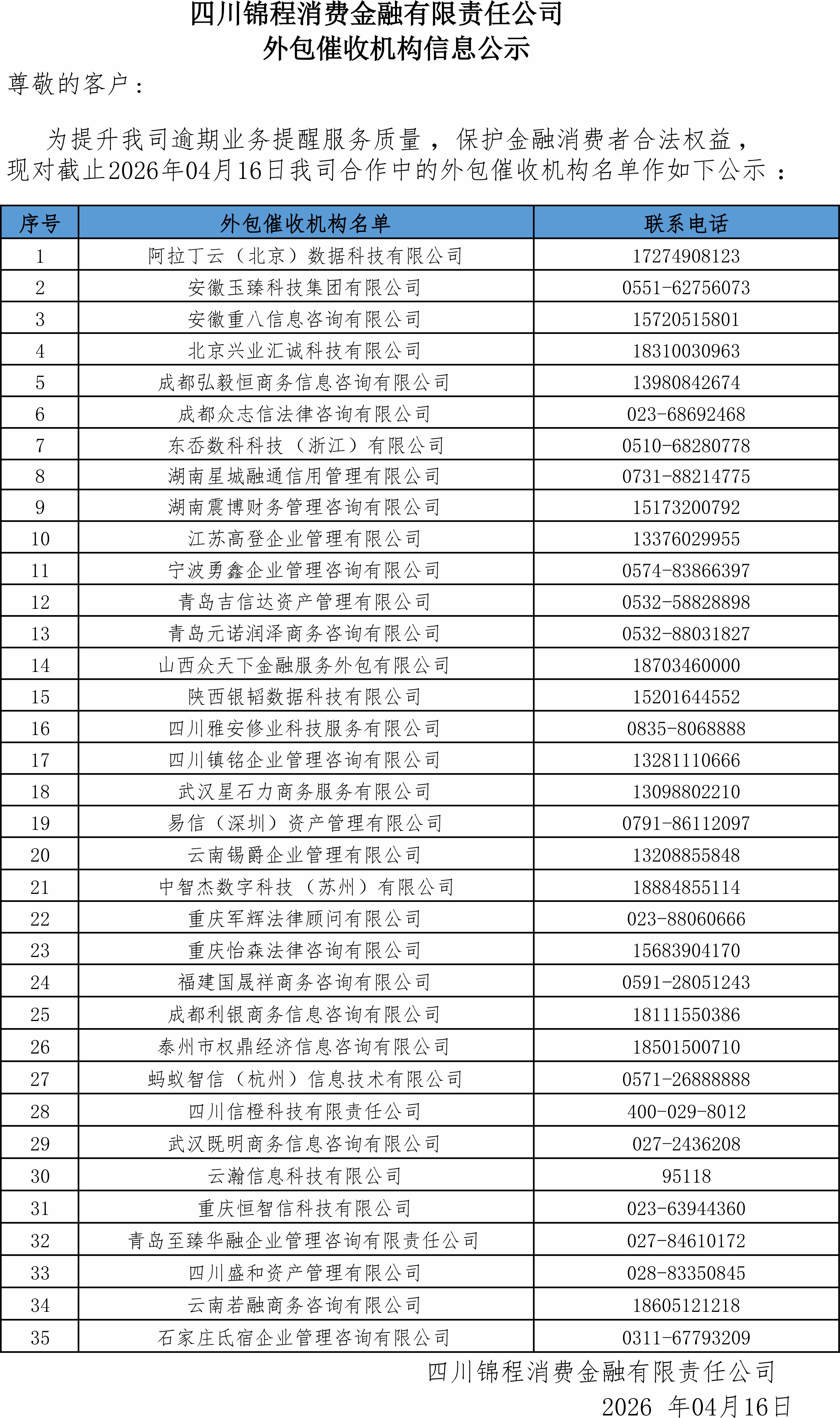 四川锦程消费金融有限责任公司外包催收机构信息公告(20260416)